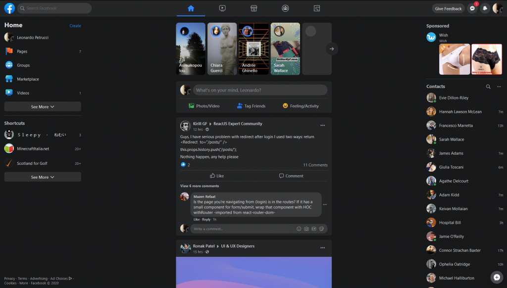 No, your eyes aren't deceiving you. Facebook has full support for dark mode. It even asks the user which one they prefer when they switch to the new design, which I appreciated. Here's how the dark mode looks: